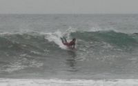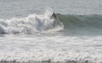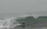 You will pass a hill, after this you can now turn left in the nearest turn towards the sea and go stragh, you be in front of the waves, it a long area of same waves, choose where to enter. no stablished spot