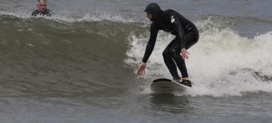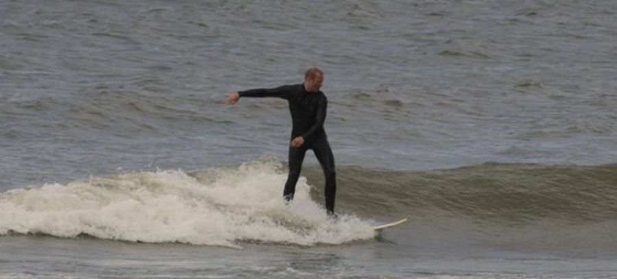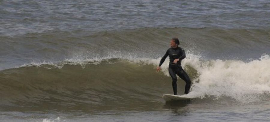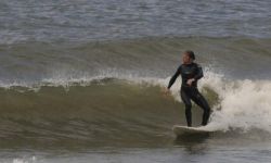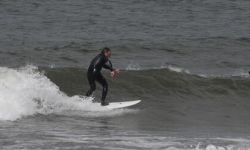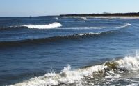Sandy beach wirh rows of wooden poles (see GooglEearth!) that protect the coastline form erosion & waves. They actually form sand-bars which waves break on. Waves are clean with SW,W wind/waves, and get choppy when wind turns to N.