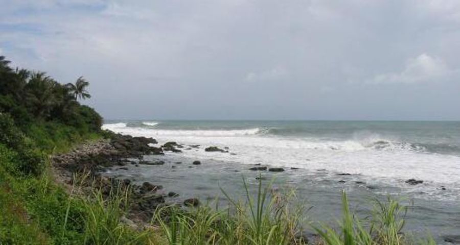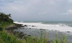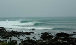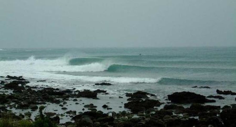 This place has a warm tropical feel. No local surfers just some curious fishermen, who most likely think you're insane. Take a couple of friends. Any place can be spooky by yourself, when you don't know it. There was a bit of a current close to the rocks. Best to come in on the little sandy beach at the end in the bay.