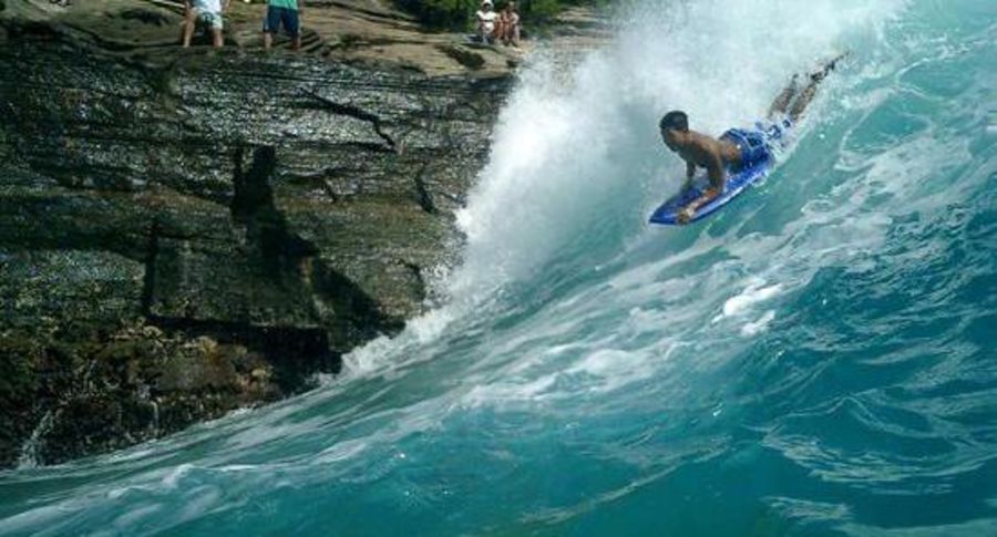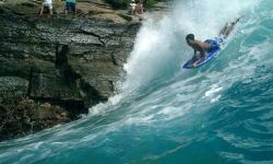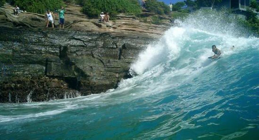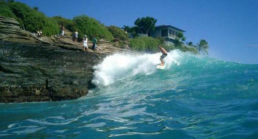 different aspects to this cool scenic spot. when small it breaks inside off a rock called the finger. when a bit larger, it breaks along side a cliffwall in a pointbreak sort of way all the way through the finger. super scary takeoff as the wave wedges off the wall. when the swell is big it shows further out into moanalua bay into china walls proper. heavy waves when itºs on.