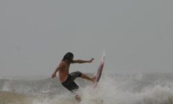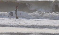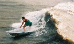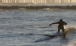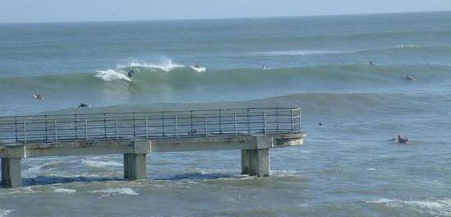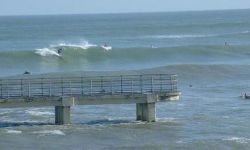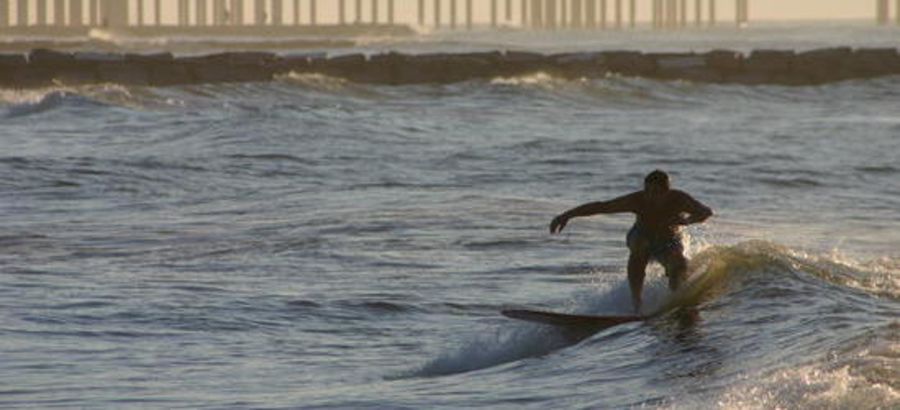 Galveston Island has several spots to surf. The Galveston Seawall from the 61st Street Pier to the Flagship Hotel Pier offers many surfing spots. Short rock groins protrude from the Seawall every few hundred yards, offering protection from currents and holding the sand in place for sandbars. The surf can range from small, blown out chop to long peeling lines hundreds of yards past the groins. Usually there is a dumping wave right at the end of the groins. Paddling out next to the groins in the rip tide makes for an easy paddle. The Flagship Hotel Pier is probably the best spot in Galveston, offering long right and left peaks off the T-Head of the Pier. 37th Street Jetty offers a steep ledgy left on the same swell. Down by the San Louis Hotel you will find slower beachbreak waves and the 61st Street Pier offers a good outside pier take off with a jetty protected inside bowl. Then there are miles of beach break south to San Louis Pass, a very dangerous spot with strong currents and many sharks as all