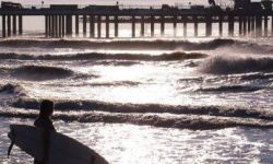 of Galveston Bay empties into the Gulf of Mexico here. The water is very shallow in Galveston as the Continental Shelf extends out for miles and miles here. Galveston rarely gets true ground swell and is usually best with a longboard.