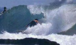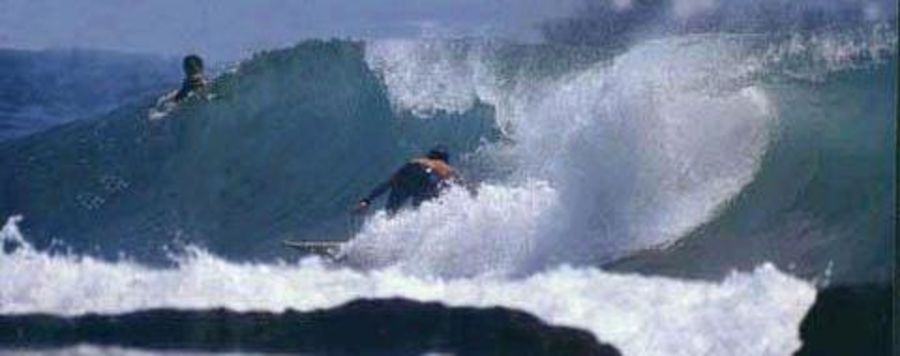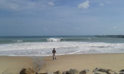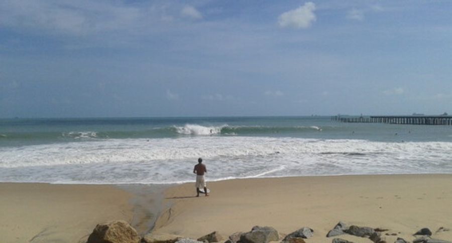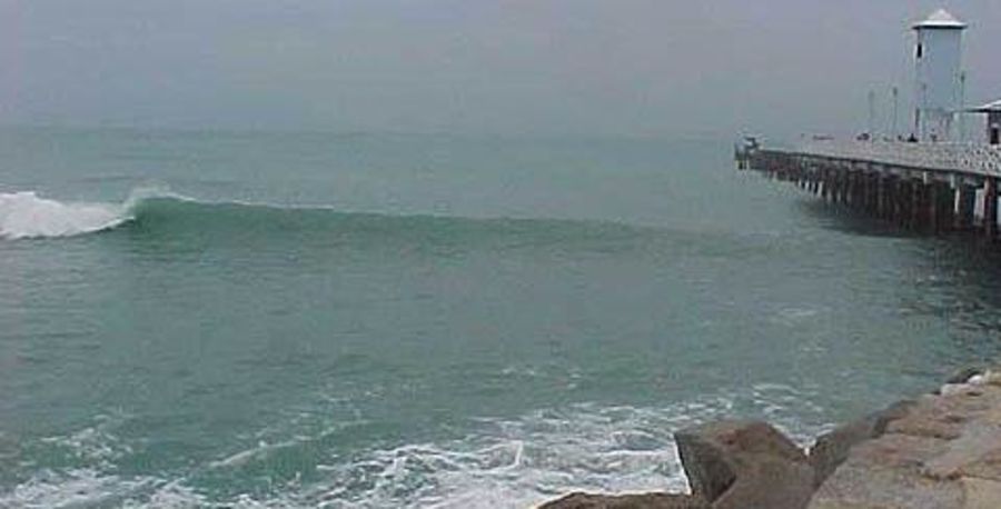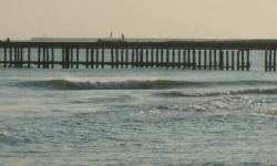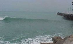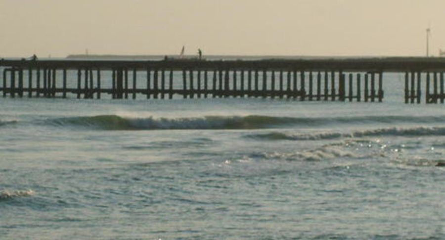 Iracema beach in Fortaleza. the wave breaks between the two piers where tourists use to see the sunset.