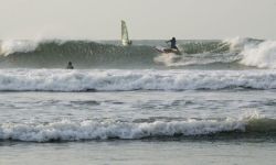 Extreme winds give an on shore swell producing a 1 to 2 meter wave at high tide. Good to get into the water and out of the heat.