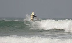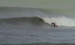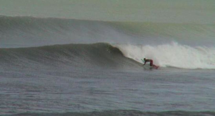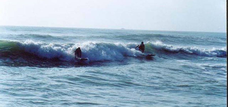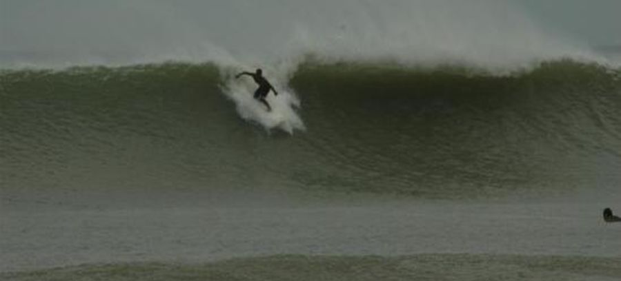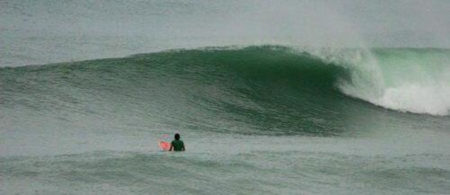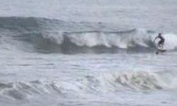 To your right will be the main break, the rivermouth peak, which is super-consistant. I've ridden it on tiny days with barely a ripple in the water (low tide only), and gotten barreled on waist-high days. It is, of course, way more fun when it's big. The rivermouth is a pretty choice A-frame. Rights are soft-shouldered and slow, good for logs. Lefts are crazy hollow and like a machine under the right conditions.