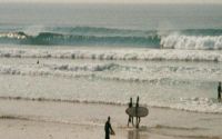 Park in the car park at the top of the beach next to kingsurf surf school. The surf will be bigger than it looks cos it is a long way away.Gets rippy and backwashy when big.
