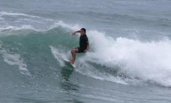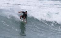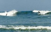 A cresent-shaped white-sand beach with rocky projections and small harbors at both ends. Surfing is beach break with some action along the harbor walls. Beach is identified in sections, from the north Iwawada; river-mouth, chuo (center); cliffs; Hama (portside). Commonly small to medium waves, occasionally big pumpers. Popular in summer as a sunbathing beach and party-town. Nearby parking, short-walk-up access, restaurants and minshuku-hotels make this a good option along with Ohara and Hebara nearby north and south, respectively. Often good nice small surf in winter without big crowds.
