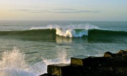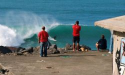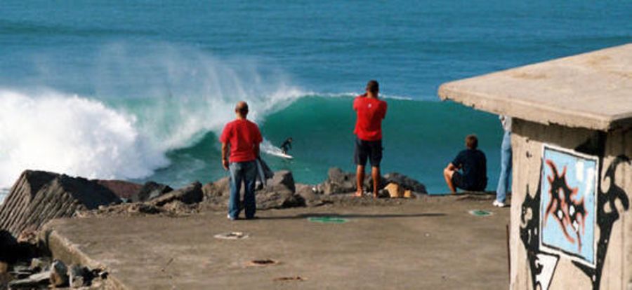 Park in the lay-by. Jump off the flat rocks when it's big to paddle straight out the back to surf the left off the point when it's huge. Take off is right next to the big protruding flat rock! Kamikazees only. Otherwise the more frequent right is excellent. Laird surfed it on a SUP.