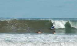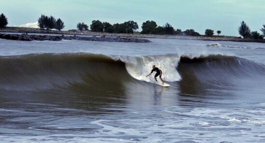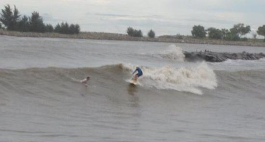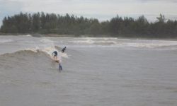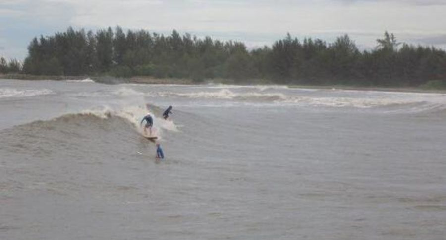 Just park your car on the man made headland. Takes 30secs to walk from their. On big days, best to climb down the rocks to jump in behind the break, unless you feel like a struggle. It's also quite shallow and sometimes hard to duckdive etc. Watch out for the middle break on a good day - probably the best Brunei has to offer.