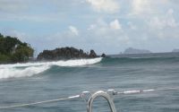 The best wave is middle where the point starts to get high and block the wind to the inside. This middle to inside can be fast and wall up. In clean conditions outside connects and its a great wave all the way to the beach. Because the clean lots of fish there are some big tiger sharks that come into the bay sometimes and can be a bit of an issue so go ashore if you see one. The black tip reef sharks are not so much of a problem and we usually don't go in for those.