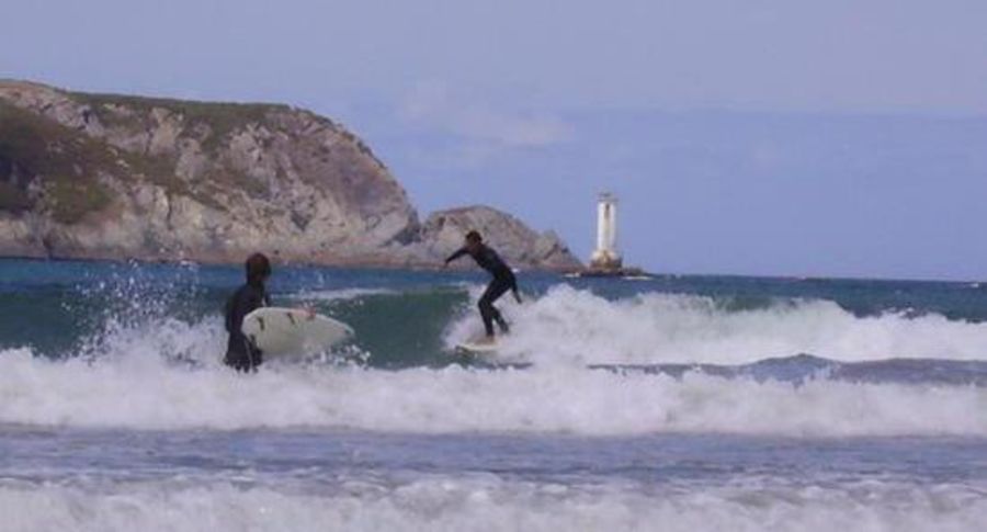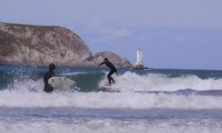 Good waves on S end at low tide beside lighthouse when rest of coast is too big (8ft+). Useful channel to the left.